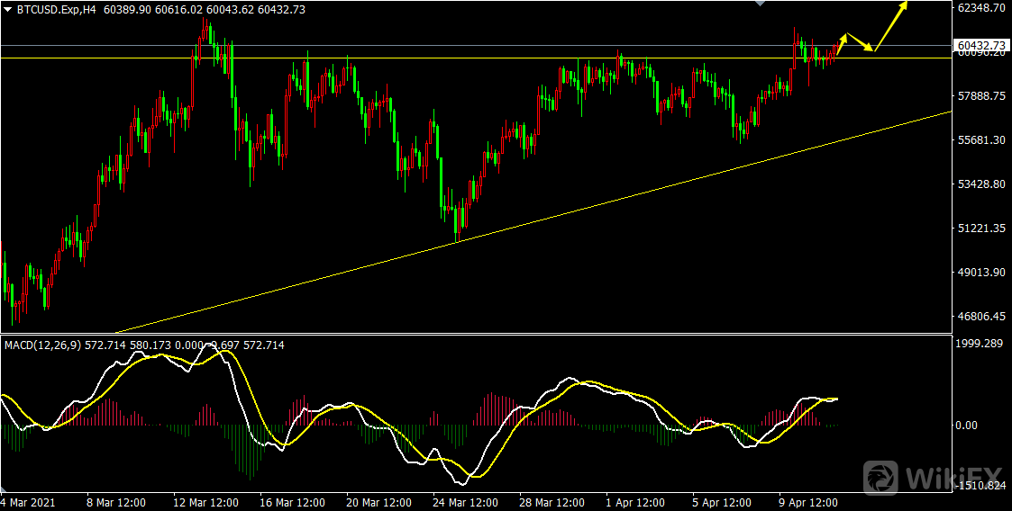 从比特币4小时图来看,比特币若能维持现在的位置不再下跌站稳60000一线,则未来有很大概率开始新的多头行情,目前是确认上破。