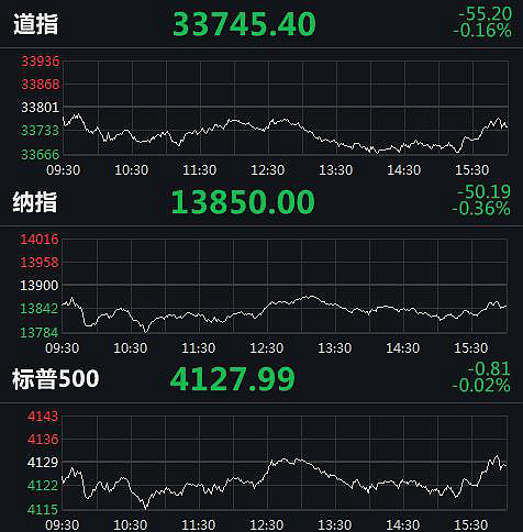 截至收盘,道琼斯工业指数跌55.20点,跌幅0.16%,报33745.40点;纳斯达克指数跌50.19点,跌幅0.36%,报13850点;标普500指数跌0.81点,跌幅0.02%,报4127.99点。