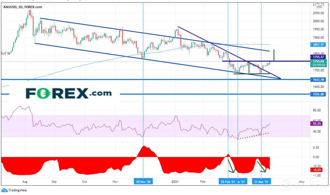 现货黄金/美元交投于一个半月最高点1755附近。2月26日,金价下破11月30日低点并跌至2020年8月以来的下降通道的下轨趋势线,即1676.90附近。之后3月上半月,黄金反弹。但到了3月末,金价再度下跌。金价考验了3月低点并没有下破。随着现货黄金/美元在4月初走高,构筑了两个技术结构:1)站上1月6日以来下降楔形的下降趋势线 2)今天摸至1758.74后形成双底。请注意在第一个低点和第二个低点之间RSI与价格的背离,表明金价或已准备好反弹。Forex