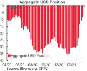 CFTC数据显示,在投机性账户中,美元空头回补的趋势延续了第七周。 美元的整体空头头寸反映在我们在本报告中监控的主要货币风险总额中,在截至周二的一周内减少了21亿美元,至60亿美元,为去年5月以来的最低水平。