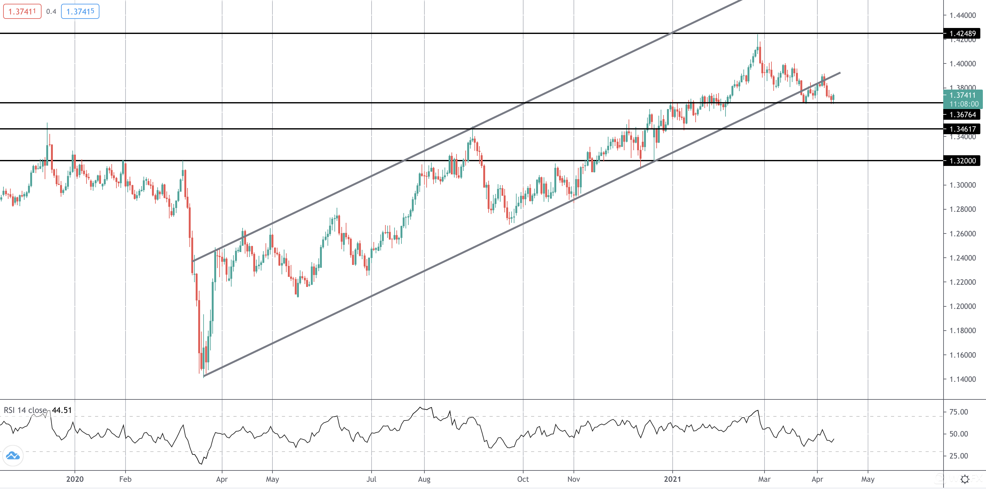 GBPUSD 从2020年低点跌破上升通道后,一直处于1.3676支撑位。 尽管目前趋势仍然看涨,但上升通道下方的崩溃带来了逆转风险