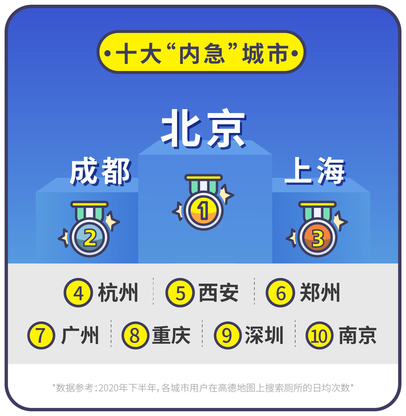 数据显示,依照各城市用户在高德地图上搜索厕所的日均次数进行统计分析,北京、成都、上海、杭州、西安、郑州、广州、重庆、深圳、南京的厕所搜索次数最多,用户对公共厕所的需求最为旺盛,成为“十大内急城市”。