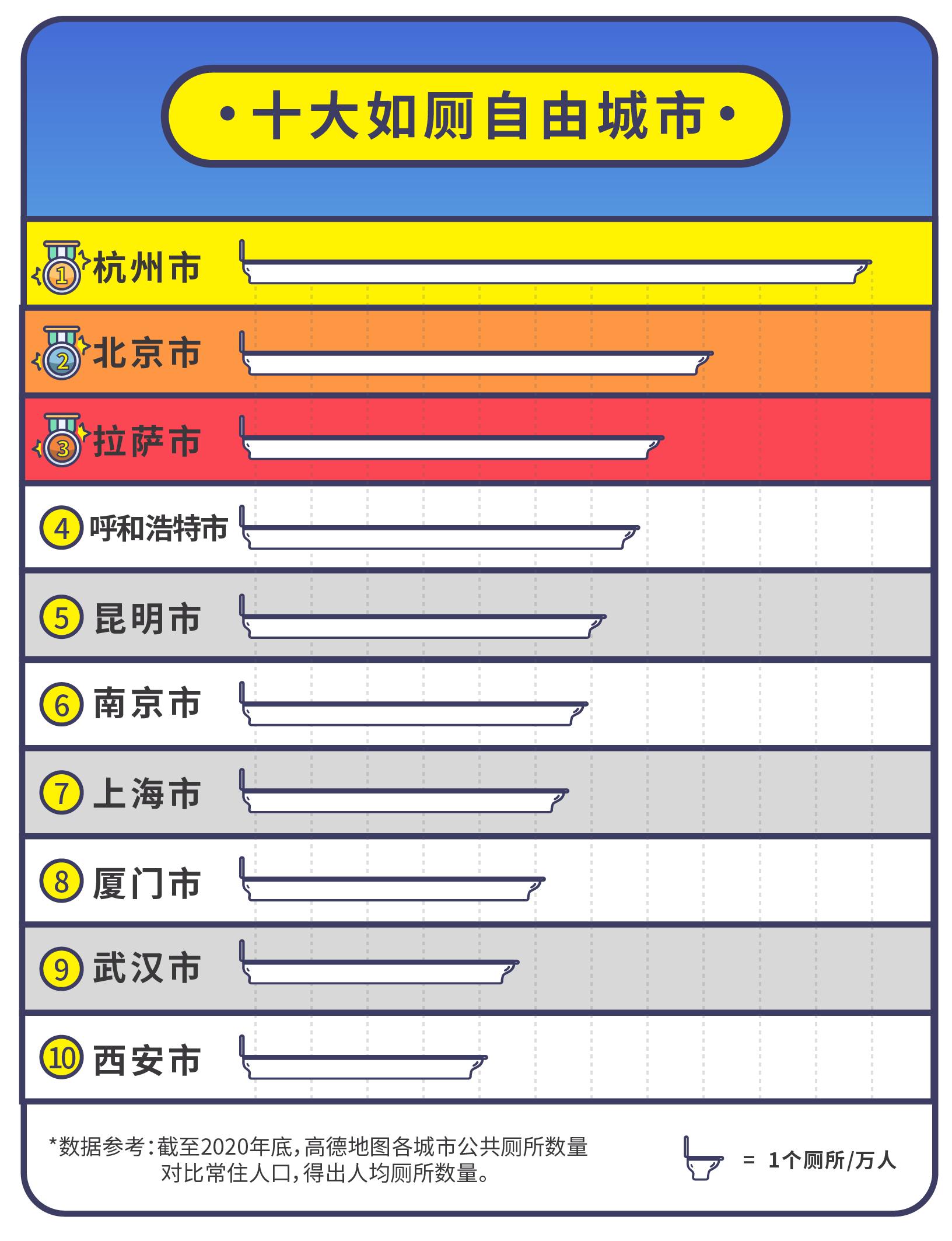 对比各城市的常住人口,杭州是人均拥有厕所个数最多的城市,可谓实现了如厕自由。其他进入十大如厕自由城市的分别是北京、拉萨、呼和浩特、昆明、南京、上海、厦门、武汉、西安。