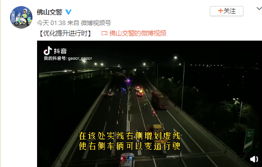 对于近日被热议的“高速天量罚单”,佛山交警官方微博4月12日晚间发布了情况通报,并在通报中表示:业主单位即日起对该路段标志标线集中进行优化改进。此后,4月13日凌晨1:38,佛山交警发布抖音视频称“优化提升进行时”,视频显示,已在该处实线右侧增划虚线,使右侧车辆可以变道往江门方向行驶。