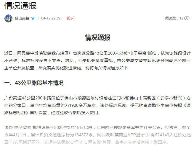 近日,网民集中反映驶经佛山市辖区广台高速公路43公里200米处被“电子警察”抓拍,认为该路段设计不合理、标志标线设置不完善。对此,公安机关高度重视,佛山市公安局交警支队迅速会同高速公路业主单位开展核查,研究落实优化改进措施。