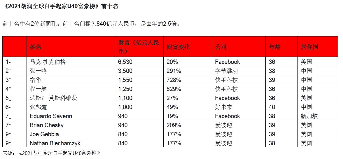 榜单显示,Facebook创始人马克·扎克伯格财富增加600亿元,以6530亿元连续第六年成为全球40岁以下白手起家首富。前六名中有四位来自中国,抖音创始人张一鸣财富增加2500亿元,达到3500亿元,位列世界第二。