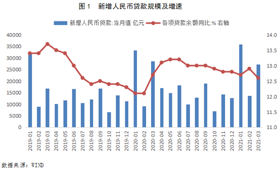 央行公布数据显示:2021年3月新增金融机构人民币贷款2.73万亿,环比多增1.37万亿,同比少增1200亿,月末贷款余额增速12.6%,较上月末低0.3个百分点,较上年同期低0.1个百分点。
