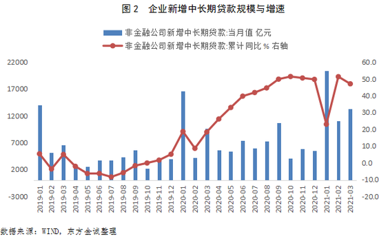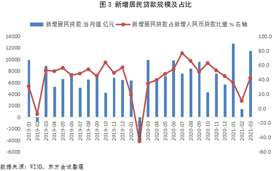 3月新增人民币贷款2.73万亿,环比多增1.37万亿,符合节后工作日增加和“季末冲量”的季节性规律。同比来看,当月新增人民币贷款比去年3月少增1200亿,拖累月末贷款余额增速较上月末放缓0.3个百分点至12.6%,在上月短暂反弹后重回下行通道。从数据表现来看,贷款余额增速放缓显示3月信用回归收紧过程。在1-2月信用扩张超预期的情况下,3月信贷投放节奏放缓也顺应了政策导向——3月22日,央行组织召开主要银行信贷结构优化调整座谈会,会上强调“保持贷款平稳增长、合理适度,把握好节奏”。不过,考虑到去年3月疫情冲击下信贷政策发力明显,今年3月新增贷款规模仅同比少增1200亿,仍超出市场普遍预期,显示紧信用虽有所释放,但政策“不急转弯”下,信用收缩仍处在相对温和的过程。