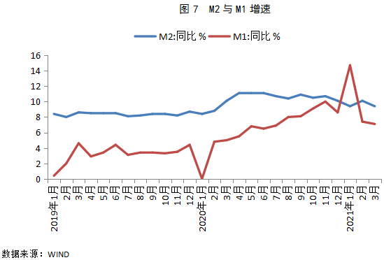 三、3月M2增速明显回落,主要原因是当月信贷增速下滑,带动存款派生减速;另外,3月财政存款少减,也对M2增速起到一定下拉作用。3月M1增速小幅下滑,主要源于上年基数抬高,环比来看,M1增长水平不低,显示实体经济仍处于较强修复过程。