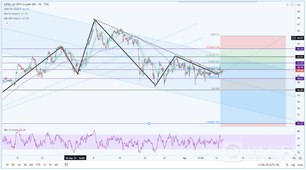看涨前景:现在决定方向还为时过早,因为大多数投资者都在屏息等待看到明确的方向。要看到一个强劲的上行走势,油价需要突破62.01美元的R2,它也与头肩模式的右肩一致。这将清楚地表明,股市没有逆转方向,还有进一步的上行空间。
