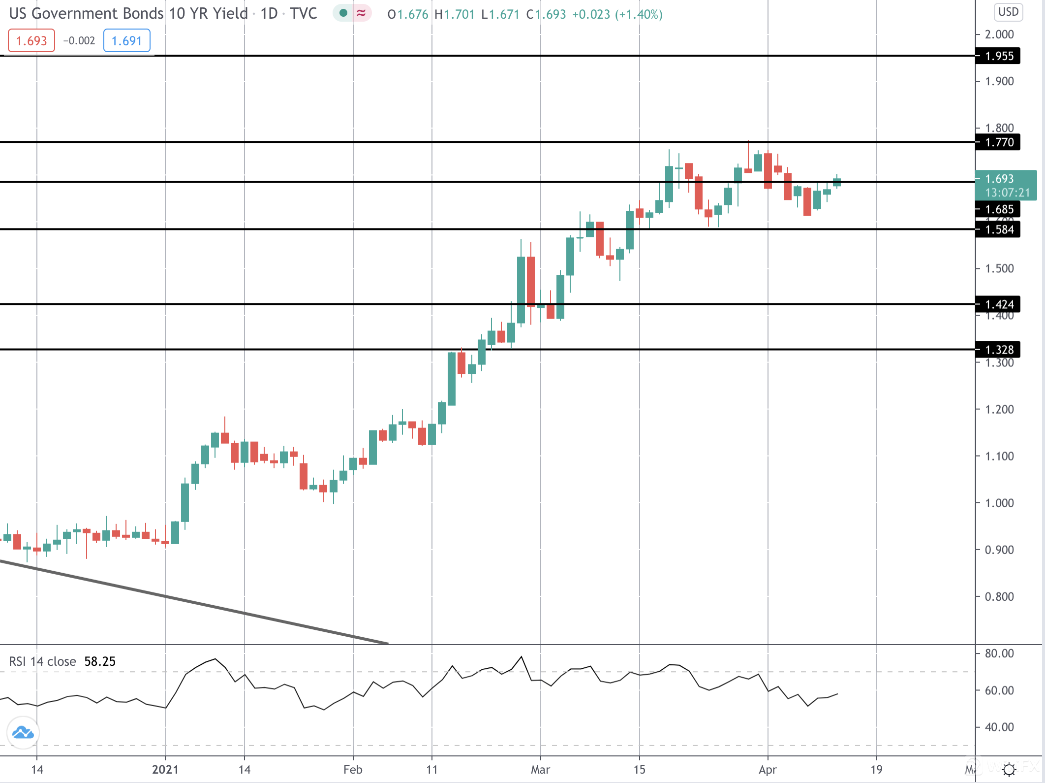 如果CPI高于预期,美国国债收益率可能会出现今天最大的上涨。目前价格正在测试1.685水平,并可能在强劲的打印上重新升至最近的1.77高点。同样,如果通胀失望,收益率可能会大幅下降,特别是考虑到美联储最近听到的回调水平。鉴于我们最近高点的熊市分歧日益加剧,1.584水平的下行突破将为向1.424的回落开辟道路