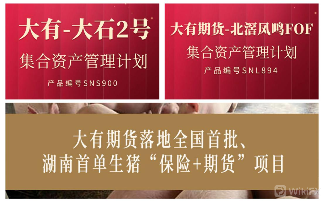 成功发行“大有-大石2号”集合资管计划、“大有-北滘凤鸣”FOF集合资管计划;与东海证券等多家金融同业签署战略合作协议;同时公司携手中华联合财产保险股份有限公司、太平洋财产保险股份有限公司在湖南省内实施的国内首批生猪价格“保险+期货”项目顺利结项,范围涉及3个县市,规模合计245.1吨,为养殖农户赔付金额41.66万元,赔付率110.8%,试点成效显著。