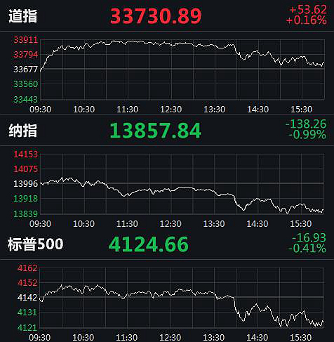截至收盘,道琼斯工业指数涨53.62点,涨幅0.16%,报33730.89点;纳斯达克指数跌138.26点,跌幅0.99%,报13857.84点;标普500指数跌16.93点,跌幅0.41%,报4124.66点。