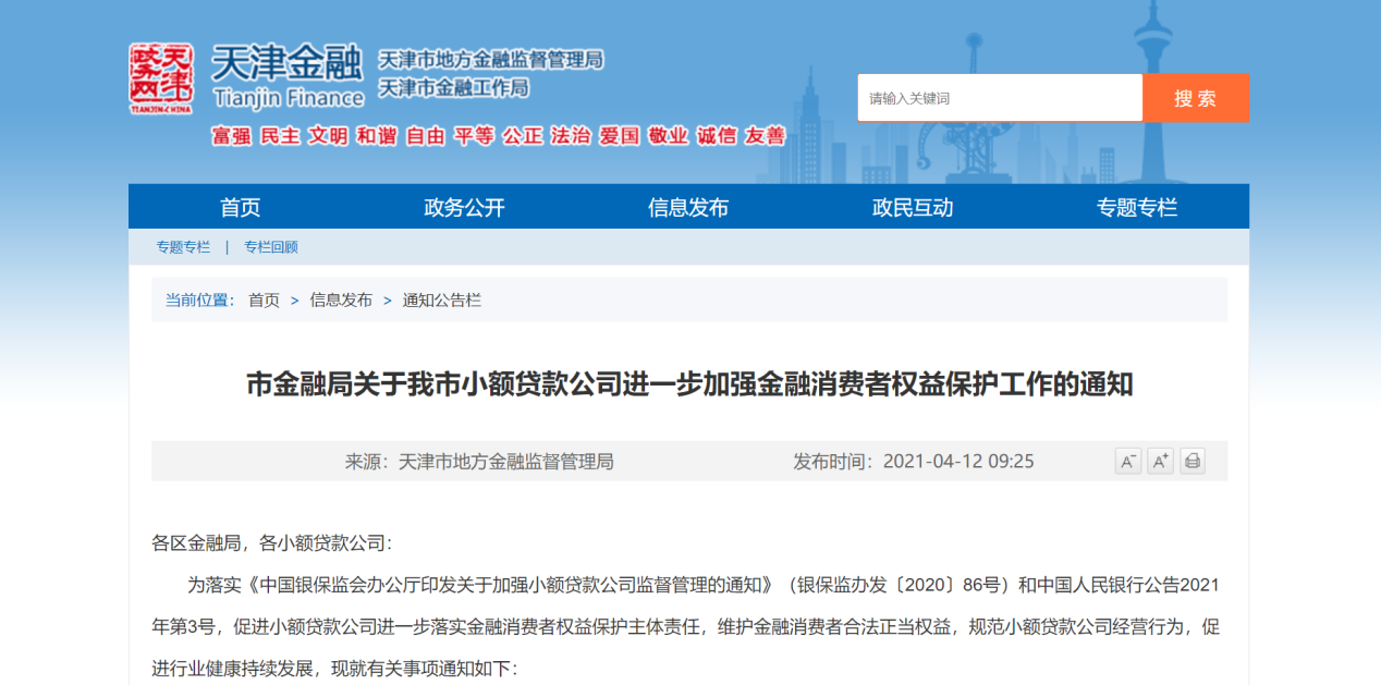 天津市金融监管局于4月12日在官网披露了该则通知的全文。记者看到,本次天津市金融监管部门向辖内注册的各小贷公司提出的6点要求主要包括:“加强服务信息明示”“规范利率和还款计划”“合理确定授信额度”“规范与第三方机构合作”“妥善保管客户信息”以及“加大消保投诉处理力度”。