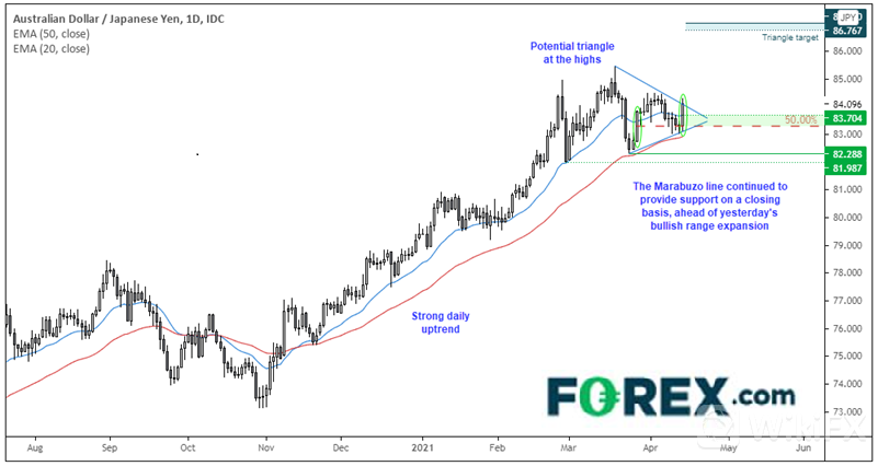 值得注意的是,澳元/日元近期的回撤止步于50%大阳线(即3月26日开盘价到收盘价实体的50%),多次都收于其上。我们怀疑现在动能已与其较长期上涨趋势看齐。