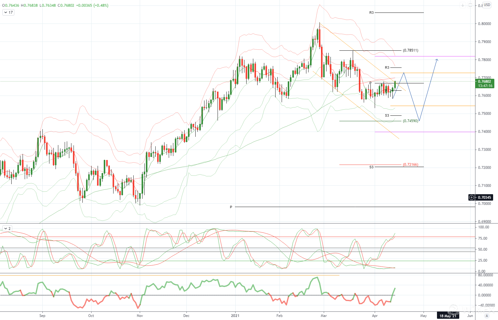 AUDUSD 日内偏差: 看跌低于.7700,目标位于.7453