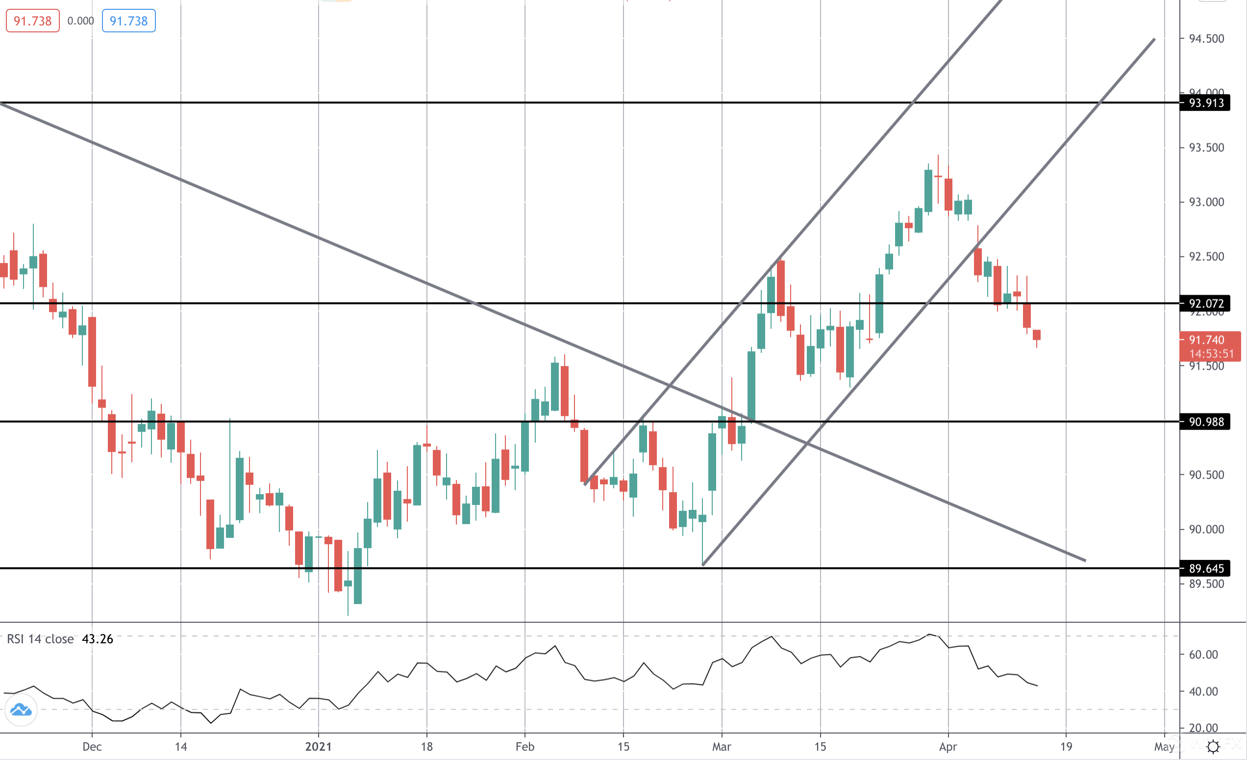 最近几周美元指数的抛售使得价格从2021年低点的上升通道中跌落。 价格现在坚定地跌破92.07水平,接下来将重点放在90.98水平的测试上。