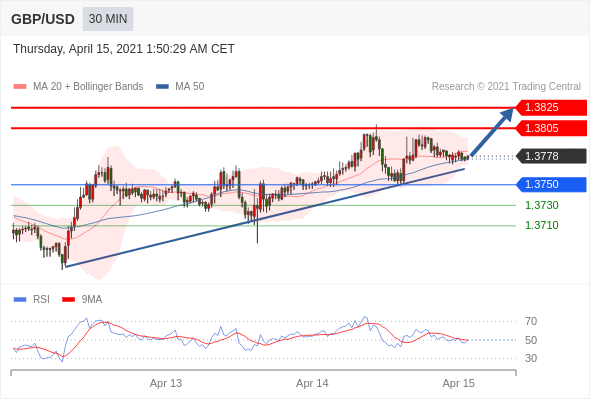 交易策略:在1.3750之上,看涨,目标价位为1.3805,然后为1.3825。