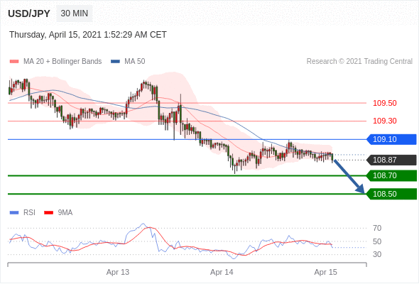 交易策略:在109.10之下,看跌,目标价位为108.70,然后为108.50。