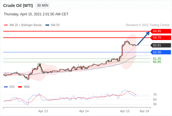 交易策略:在62.00之上,看涨,目标价位为63.70,然后为64.45。