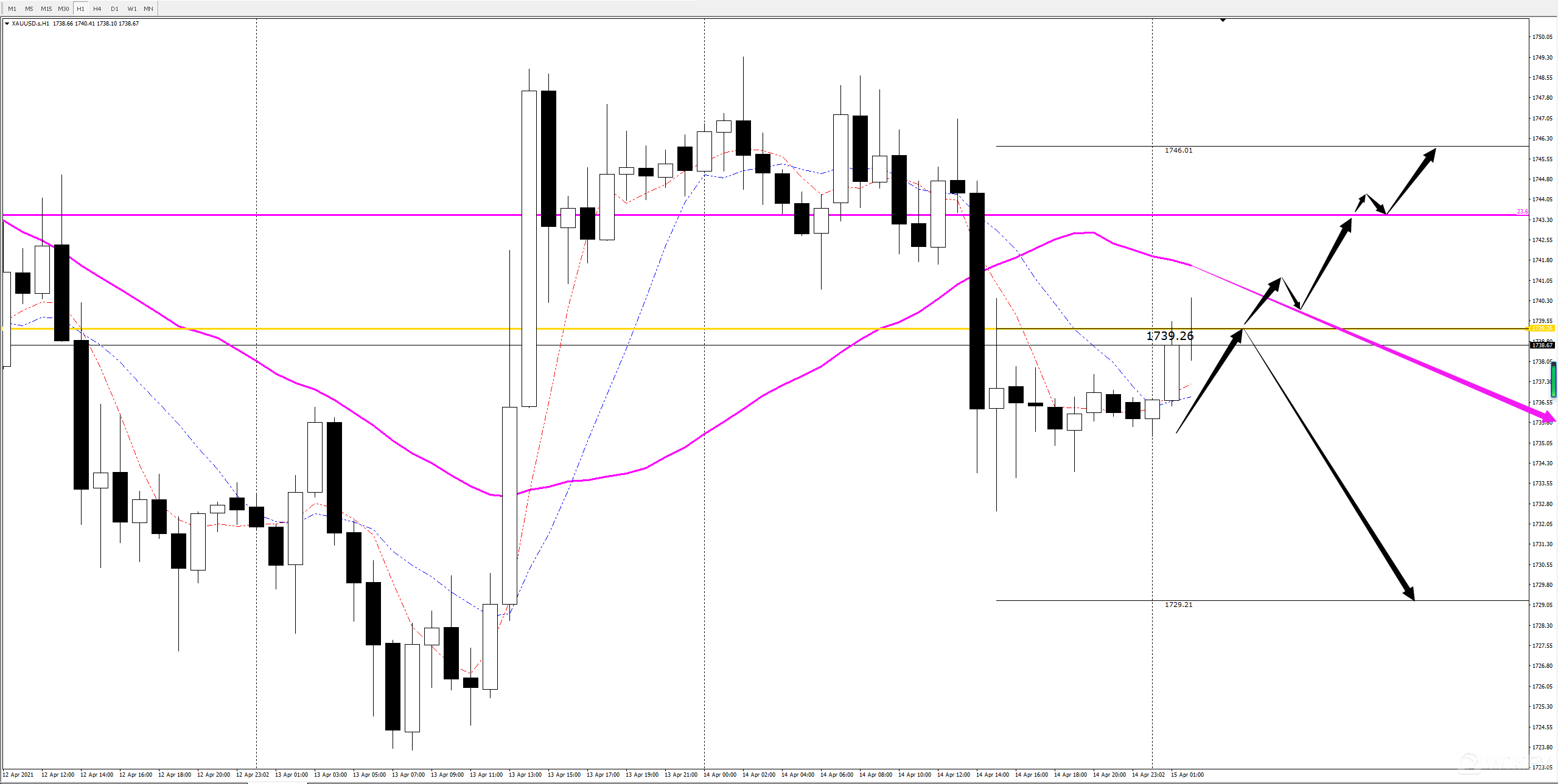 今晨黄金开盘仍开于小时图级别静态多空分界(1,739.26)下方不远处半悬空,随后亚盘时段行情开启小幅上行,去试探静态多空分界压力有效性。