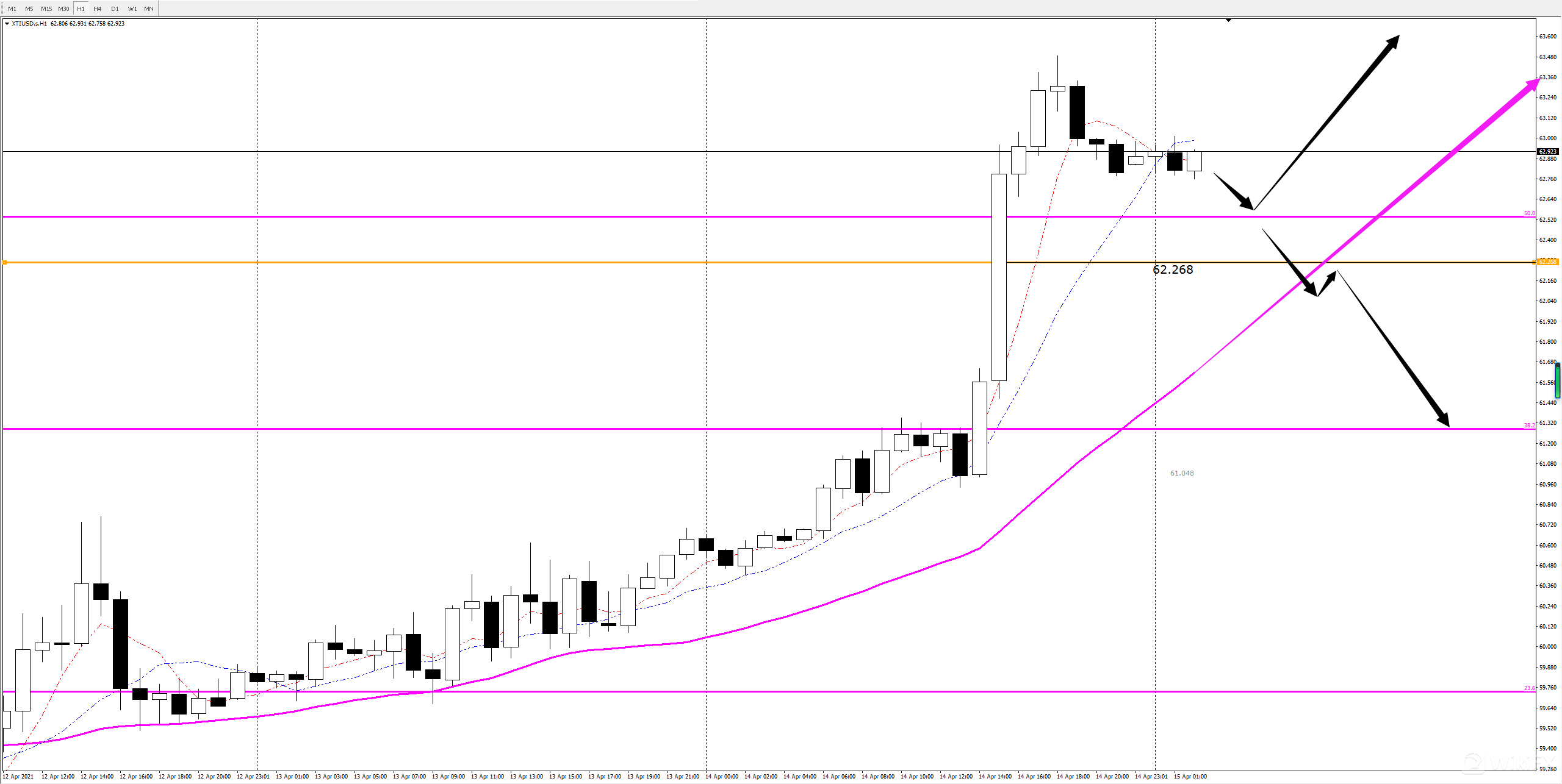 若行情日内能够有效回调至下方黄金分割50线位置附近,并做出有效验证支撑形态(阴线下影线+阳线下影线)且于盘中做出动能由空转多迹象,则可考虑继续参与原油多单进场;若日内行情动能持续下行,则需注意近日以来原油持续保持小时图级别动态多空分界上方强势多头上行,且下方存在黄金分割50线、静态多空分界62.268线、动态多空分界ma30线三重支撑坚守,除非行情能够下破下方三重支撑,否则千万不要尝试抄顶做空。