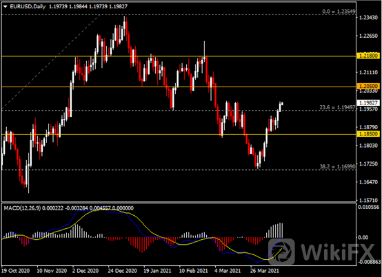 日线图显示欧元兑美元震荡上行,当前收于前高1.1950。从MACD来看,快慢线向上运行,白色动能柱则稍有收敛。汇价走势和动能柱的变化略呈分歧。