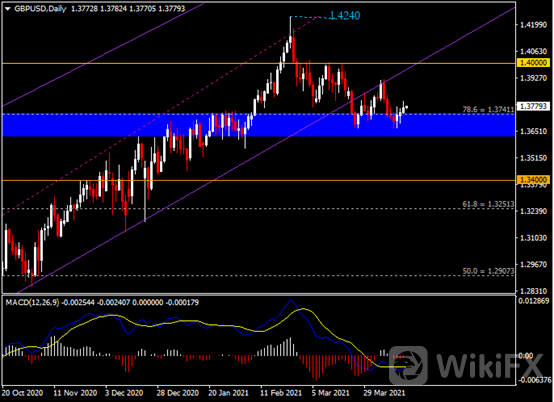 日线图显示英镑兑美元录得3日连涨,当前收于前高1.3740。从MACD来看,快慢线欲形成金叉,红色动能柱温和收缩。汇价走势基本和动能柱的变化一致。