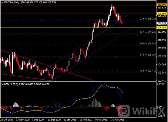 日线图显示美元兑日元震荡下挫,当前承压于通道趋势线阻力和109.20阻力。从MACD来看,快慢线向下运行,红色动能柱温和放量。汇价走势基本和动能柱的变化一致。