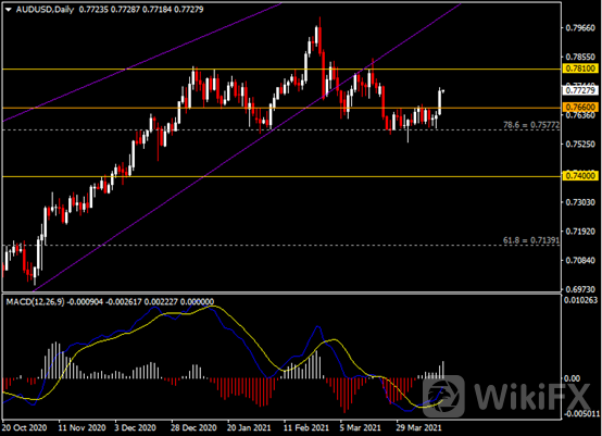 日线图显示澳元兑美元强势走高,当前收于前高0.7660。从MACD来看,快慢线拐向上行,白色动能柱温和放量。汇价走势基本和动能柱的变化一致。