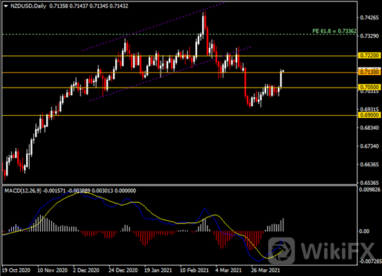 日线图显示纽元兑美元扩大涨幅,当前测试0.7130区间阻力。从MACD来看,快慢线拐向上行,白色动能柱温和放量。汇价走势基本和动能柱的变化一致。