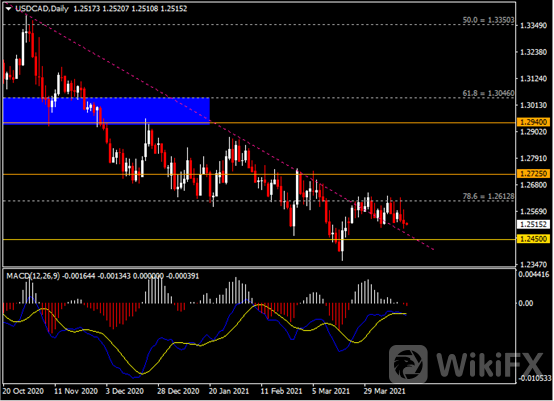 日线图显示美元兑加元震荡下行,当前承压于1.2610阻力。从MACD来看,快慢线死叉依旧,红色动能柱温和增量。汇价走势基本和动能柱的变化一致。