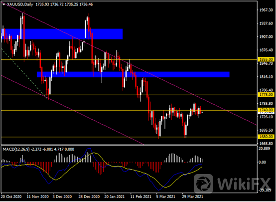 日线图显示金价承压回调,当前收于1740阻力。从MACD来看,快慢线逐渐收窄,白色动能柱持续收缩。金价走势基本和动能柱的变化一致。