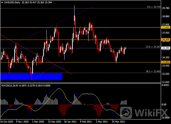 日线图显示银价温和上行,当前测试25.40阻力。从MACD来看,快慢线向上运行,白色动能柱温和增量。银价走势基本和动能柱的变化一致。