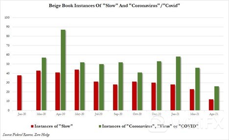 随着经济加速,这份报告中使用的缓慢(slow)一词的次数降至12次,几乎比上个月的23次减少了一半。同时,报告中新冠或病毒的次数也大幅下降,表明美国经济已经为继续复苏做好准备。