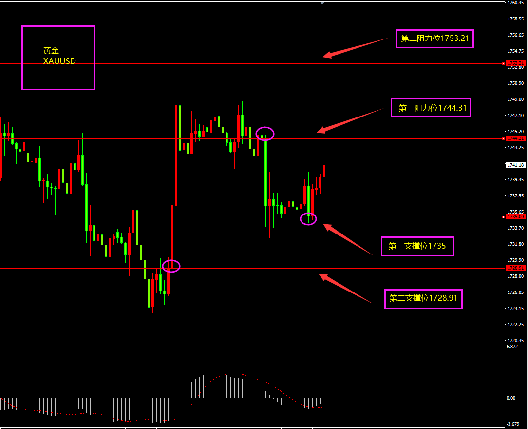 技术点评:原油昨日收大阳线,价格大幅冲高,打破近期长期震荡区域,短期市场回暖,需求量上升,促使价格再度冲高,日内更多震荡带有一丝上行为主?小时图原油期间连续大阳线拉升,MACD位于0轴之上,多头占优,短期上方有阴线产生,多头有所放缓,逐渐开辟震荡区间,日内更多偏向高位震荡为主?