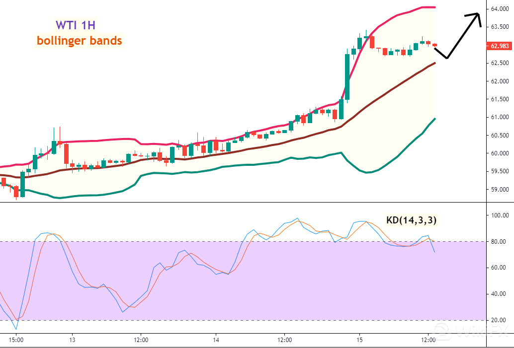 美油(WTI)一小时图 –Bollinger Bands及KD指标