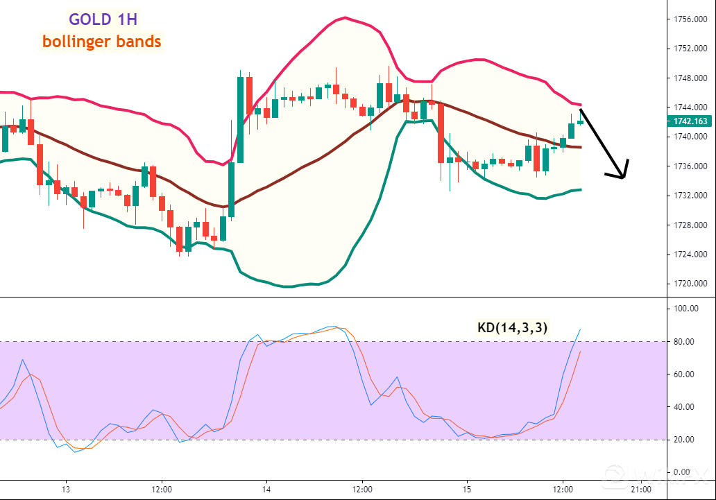 黄金(GOLD)一小时图 –Bollinger Bands及KD指标