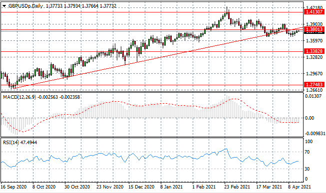 The GBPUSD has begun to find support after the break of the ascending trendline and 1.380 support level. Another attempt will now be made at the 1.380 price level. Buyers conviction will be tested. Momentum indicators have flattened in neutral territory.