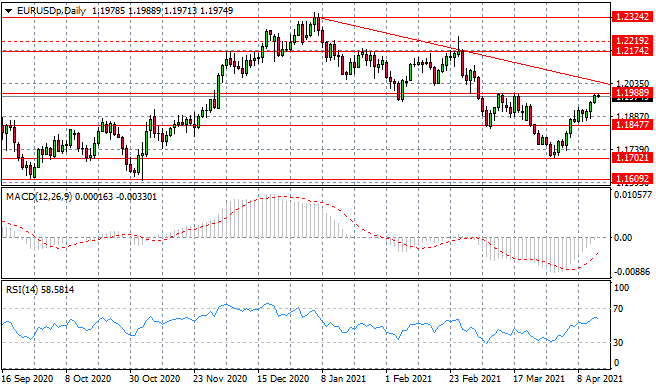 The Eurodollar price recovery has taken the pair back to test the 1.198 resistance area. Price action is moving closer to the descending trendline which has contained any rally attempts since late December 2020. Momentum indicators are bullish.