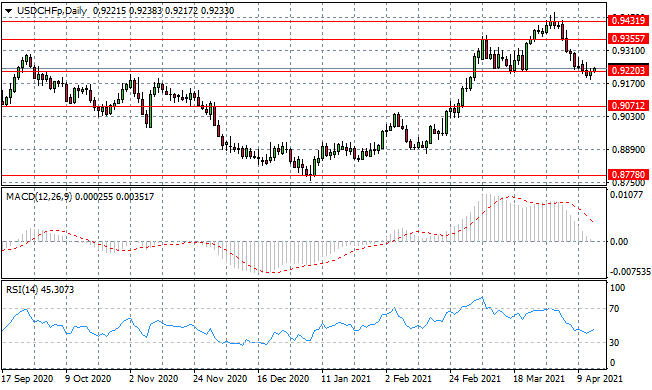 The USDCHF pair appears to have stalled at the 0.922 price area, where buyers have returned. The break therefore may not be sustained and the 0.922-0.935 range will remain intact. Momentum indicators are mixed; with RSI beginning an upward move and MACD remaining sharply bearish.