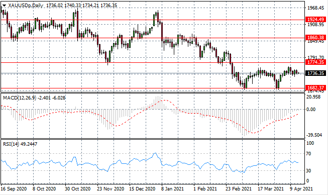 XAUUSD has nowhere to go. The metal has flatlined mid-range between the 1682.27-1774.35 price levels and neither buyers nor sellers have the appetite to drive a price action. Momentum indicators are mixed; with MACD approaching the zero line and RSI flattening in neutral/bearish territory.