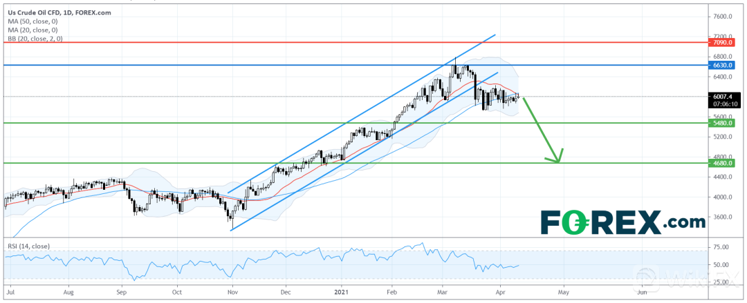 从技术角度看,如日线图所示,美国原油CFD已呈现反转向下的讯号。它已跌破了11月以来的上升通道,而20日移动均线已下破50日移动均线。