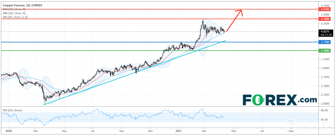 从技术角度看,如日线图所示,芝商所CME铜期货(5月合约)保持着稳健的上涨趋势。目前,它在盘整区内交投,而50日移动均线及去年4月以来的上升势趋势线预期将带来支撑。