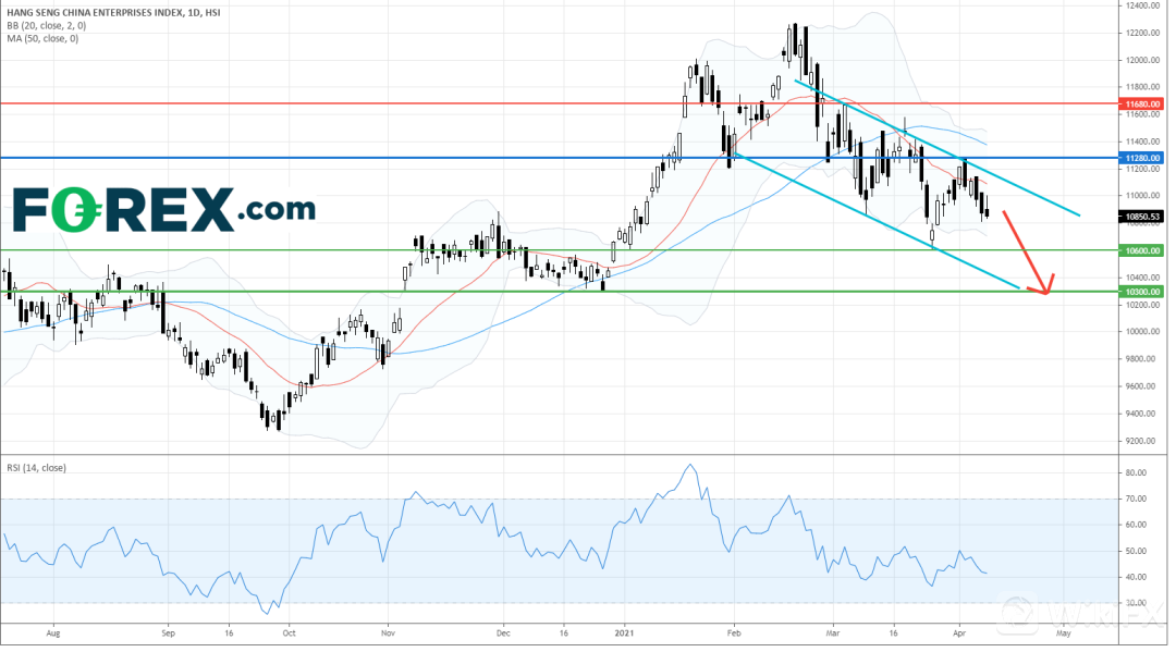 在日线图上,恒生中国企业指数仍在下降通道内交投,表示市场的回调尚未结束。目前,指数价格仍在下跌的20日和50日移动均线之下交投。