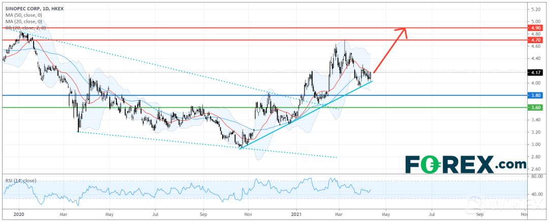 从技术角度看,如日线图所示,中石化股价的前景审慎看涨。目前,它受到去年10月以来的上升趋势线支撑,并回到50日移动均线上方。