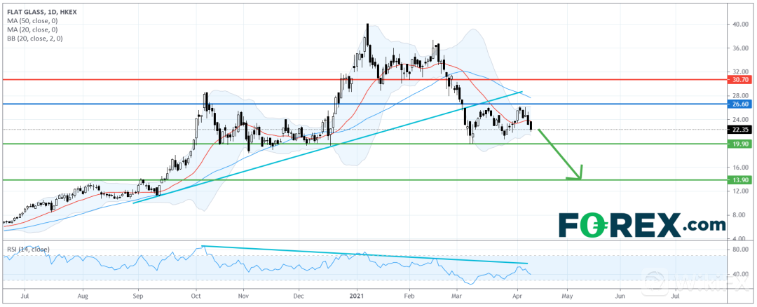 从技术角度看,如日线图所示,福莱特玻璃股价走势已经反转向下。它跌破了去年9月以来的上升趋势线,相对强弱指标呈现看跌背离。