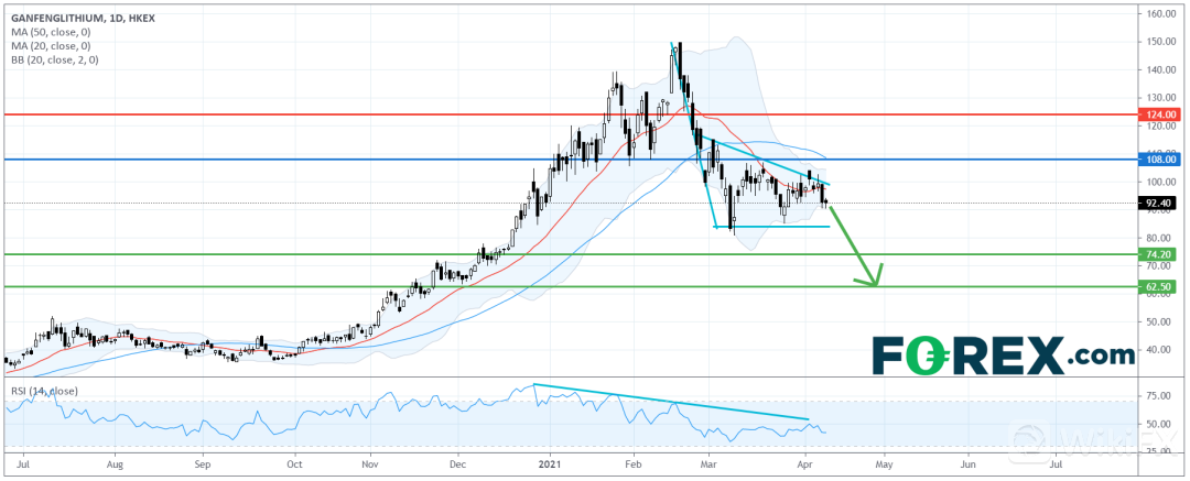 尽管市场对赣锋锂业的憧憬依然,从技术角度看,如日线图所示,股价的下行调整未有完结的迹象。此前,它跌破了11月以来的上升趋势线,目前在下跌旗形内交投。