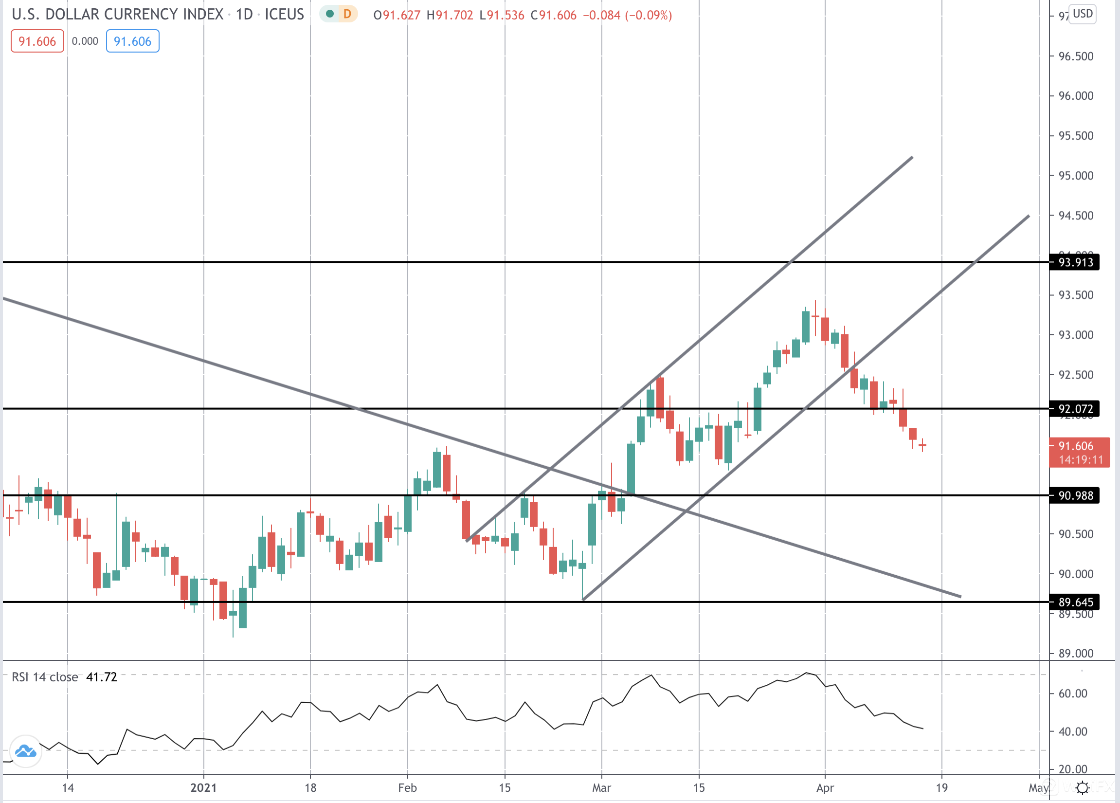 近几周来,美元逆转了先前的升势,美元指数从93以上的高位回调至目前的91年代中期。这在很大程度上是对美联储有关通胀和收益率上升的一贯信息的回应,也就是说,它不担心通胀的任何暂时飙升,收益率也没有异常上升。本周最新公布的美国CPI报告显示,美元进一步走低,尽管公布了利好数据,但该数据并未反映一些人所期待的通胀飙升。交易员们现在将关注今日美国3月零售额,据预测,3月零售额将分别为5.8%(标题)和5.1%(核心),这两项数据每月都会有明显改善。不过,要想让美元再次走高,可能还需要一个更强劲的指数。