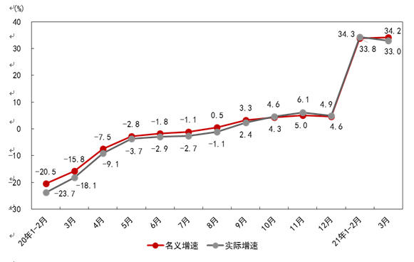 复苏态势进一步增强。3月份,全国疫情防控形势持续向好,疫情对消费市场的影响不断减弱,消费需求加快释放。3月份,社会消费品零售总额同比增长34.2%,增速比1—2月份加快0.4个百分点;两年平均增长6.3%,比1—2月份加快3.1个百分点。